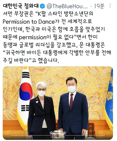 셔먼 미국무부 부장관 퍼투댄 전세계적 인기라고하며 한미관계는 퍼미션 필요없어