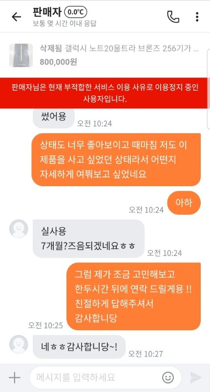 나 21살인데 알바한 돈으로 폰 요금제는 그대로 쓰고 최신폰 공기계 사서 유심만 바꾸고 쓸려고 당근마켓에서 알아보고 있었는데 아침에 마음에 드는 상품이 있길래 판매자랑 채팅까지 했었는데 오후에 사기꾼이였다고 알림 오더라 ㄷㄷ 진짜 폰이든 뭐든 비싼 전자 기기는 돈 몇푼 더 주더라도 공식 판매점에서 사거나 공식 온라인 쇼핑몰에서 사 얘들아 혹시나 나중에 너네가 20살 넘어서 비싼걸 중고로 살 때 이런일 안당했으면 해서 10대판에 적어봤어 조심해 !!