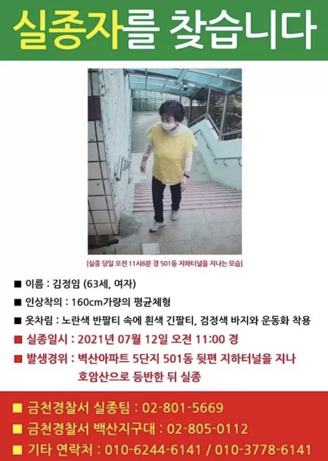 7월 12일 오전 11시 경 김정임 님이 호암산(서울 금천구 시흥동)을 가볍게 산책하러 떠나신 이후 열흘이 넘게 돌아오고 있지 않습니다