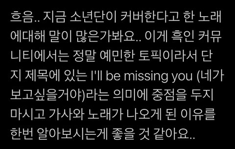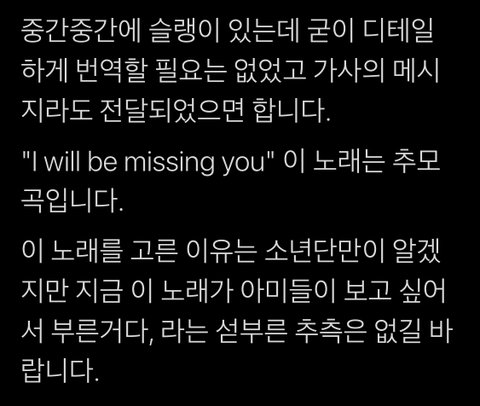 2. 그렇기에 제목에 초점을 맞춰 네가 보고싶을거야 = 아미가 보고싶을거야 로 가기보다 곡의 내용과 바탕이 된 사건에 조금 더 관심을 가졌으면 함