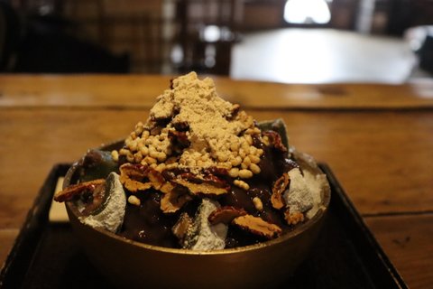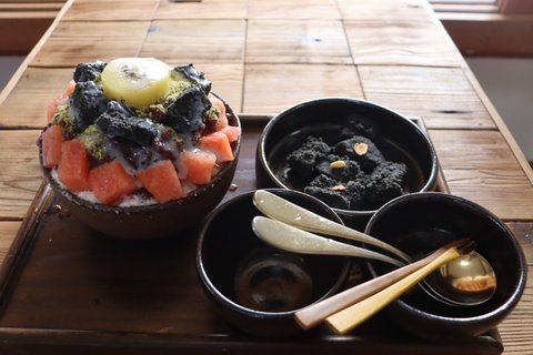 어김없이 팥빙수. 여기는 특이하게 흑임자인절미와 키위, 수박을 잔뜩 얹어줌.