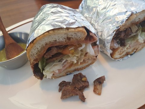 타코, 브리또 말고 특별한걸 먹고 싶어서 시킨 메뉴. 바게트보다는 살짝 부드러운 빵에 돼지고기, 소고기와 야채가 들어감. 맛있었지만 저거 먹고 점심 또 먹었음.