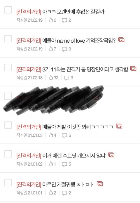 방학인데도 화력 확실히 줄었노.. 처음 만들어졌을때 하루에 글 진짜 많이 올라왔던것같은뎅.. 애니 팬톡이 활성화된건 거의 처음이였던것같은데 아쉽다