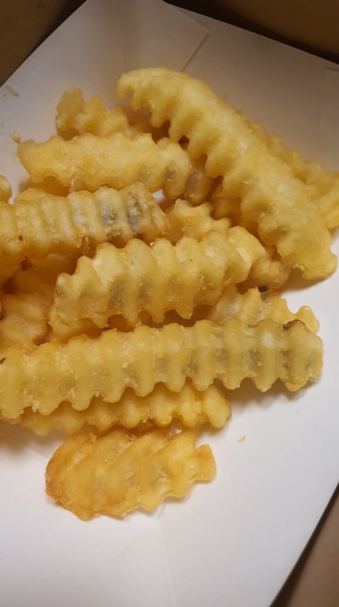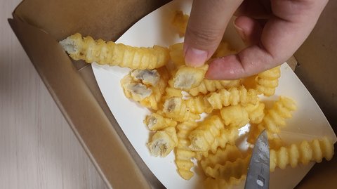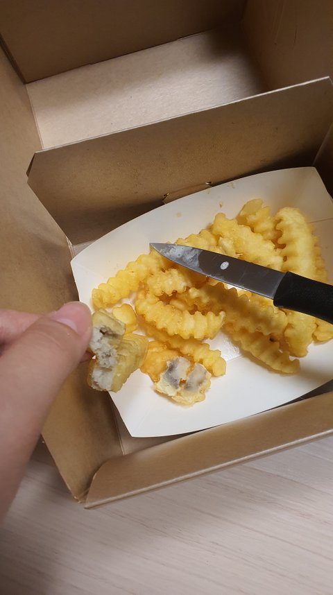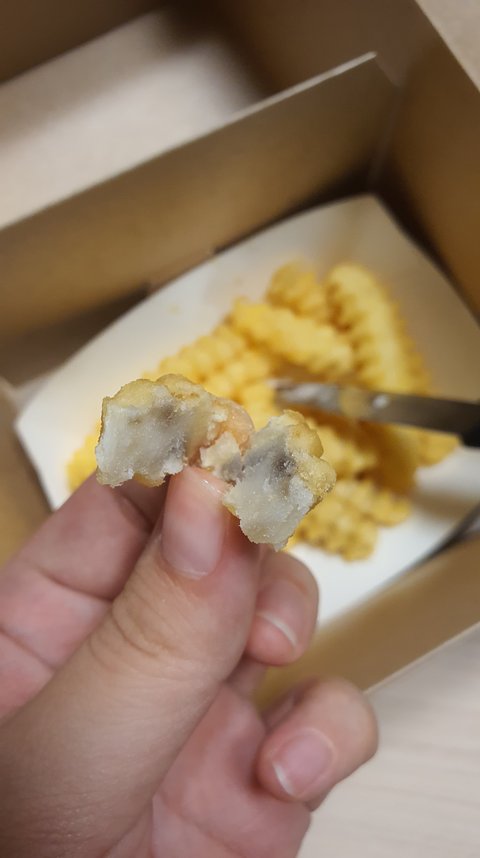 감자튀김을 하나 집어 먹었더니 오묘한 맛이 나더라고요. (썩었다는 아닌데 상해간다는 느낌) 근처에 검은 색이 좀 진한 감자들이 많았고 쿠팡이츠에 전화해서 교환 혹은 환불해줄 수 있는지 문의했어요. 사진찍어 보냈고요.