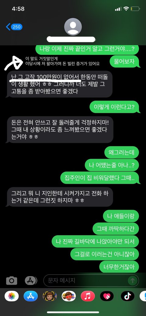 근데 나는 적어도 너처럼 속이고 기만하고 거짓말을 거짓말로 덮지는 않았고 처음부터 아이들의 존재에 대해서 다 이야기하고 만났었던거 니가 인정했잖아? 증거도 보여줬고