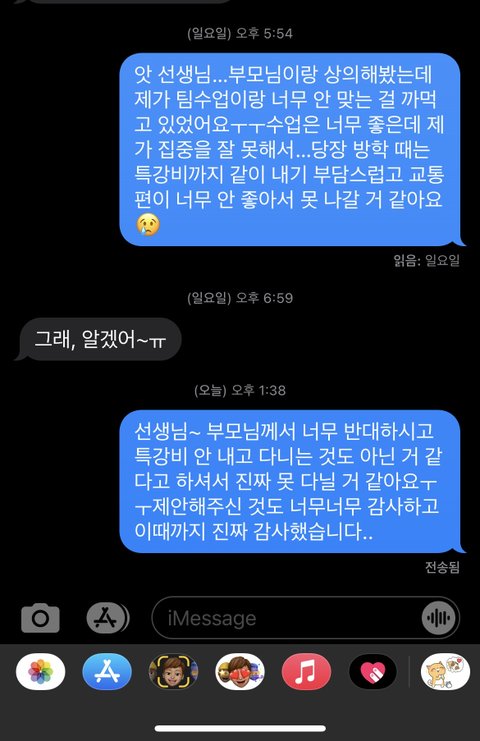 고3이고 정시러인데 원래 학원 아무것도 안 다닌단 말이야 근데 6모 치고 충격받아서 국어학원 한 달 다녔는데 너무너무 안 맞는 거야,,,팀 수업 집중도 안 되고 비용에 비해 아까운 거 같은 퀄리티…그래서 저번에 메시지로 방학 특강 비용이 부담스럽다는 핑계로 끊는다고 말씀드렸걸랑 근데 전화로 그럼 방학 특강비는 안 받을테니까 나와라 너 수능 안 칠 거냐면서 그러시는 거야 순간 너무 감사해서 아…그럼 다음 주부터 나갈게요~ㅎㅎ;; 약간 이랬는데 생각하니까 수업이 도움 되는지도 모르겠는데 나 때문에 학원에 돈 쓰는 엄마한테 미안해서 끊어야할 거 같은 거야 그래서 저렇게 메시지 보냈는데 읽씹당한 상태야 근데 죄책감 진짜 많이 드는 거 있지 학원비도 깎아주신 건데 배은망덕 그 자체,, 나 잘 한 거 맞을까..?