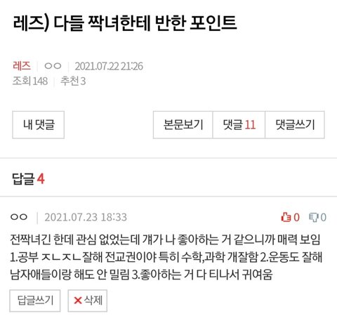 여친은 다른 반 친구인데 친구의 친구였어 여친이 레즈인 건 우연히 대화를 듣게 돼서 알게 된 건데 그 대화가 여친이 나 좋아한다는 대화였거든 그 이후로 관심갔는데 다음 연도에 같은 반이 됐어 조별과제 할 때 같은 조였는데 걔가 버스 태우는 거 보고 공부 잘하는구나 했는데 전교권이더라고 특히 수학,과학 좋아하고 잘하는 근데 걔가 나한테 과학 모르겠다고 알려달라고 했어ㅋㅋㅋㅋ 그때 '아 얘 아직도 나 좋아하는구나' 알았지 근데 내가 과학 못한다고 하니까 걔가 당황하더라ㅋㅋㅋㅋ 그렇게 친하지는 않은 상태로 있었긴 한데 친구끼리 친하니까 그룹콜도 자주 했단 말이야 그러다가 썸을 타게 됐음ㅋㅋㅋㅋ 걔 나만 보면 귀 빨개져서 다 티 나더라 그러다가 겨울방학에 둘이 놀다가 걔가 고백해서 사귀게 됐어! 많이 생략되기는 했지만 언제 한 번 자세히 풀어볼게 아웃팅은 걱정 안 해도 되는 상황이라 암튼 지금까지 잘 사귀고 있어 너네들도 잘 되기 바랄게