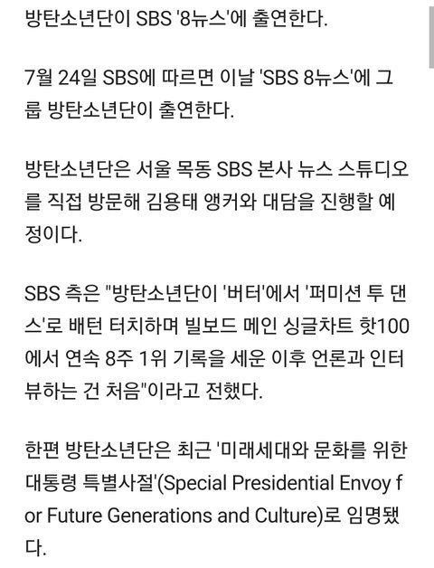 방탄 10시 30분에 SBS 뉴스 나옴