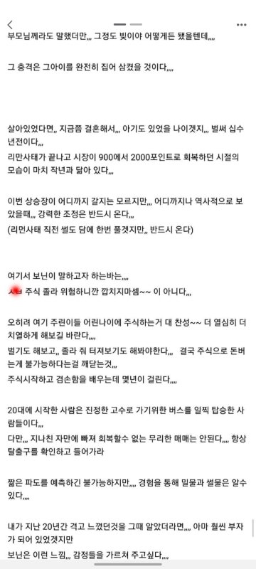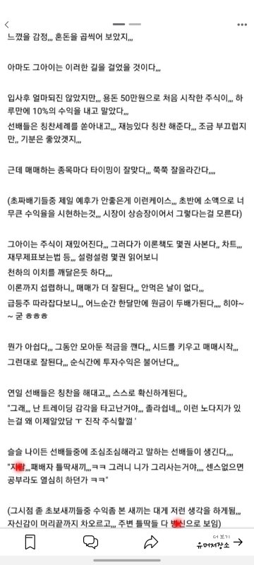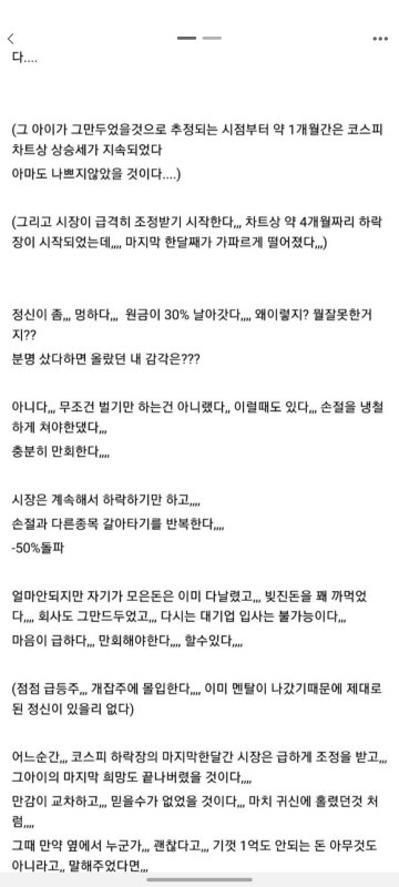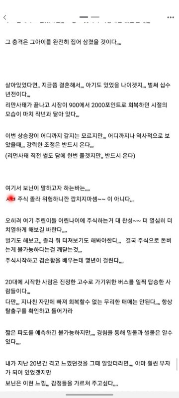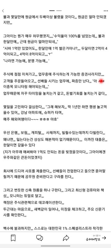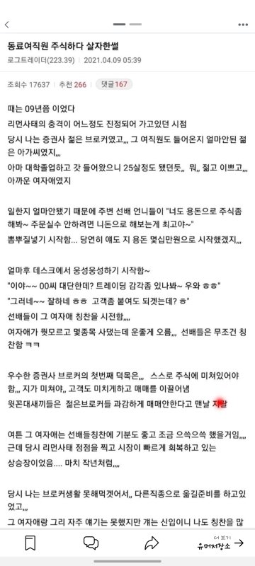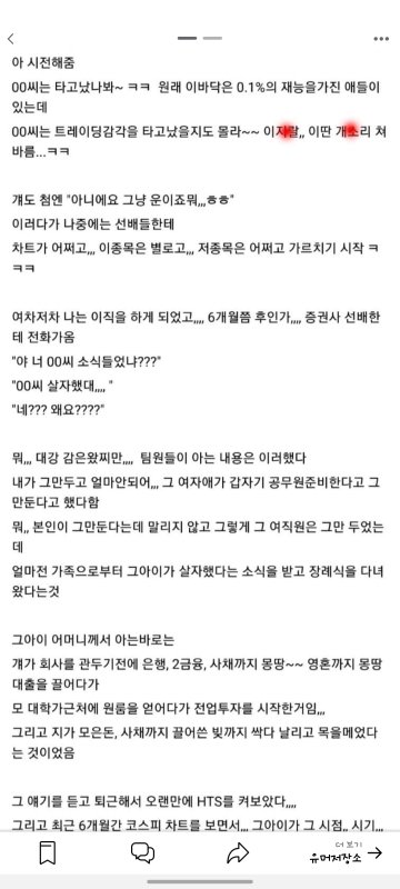 팩트는 주식하다가 스스로 목숨 끊었다는 거 하나인데 저 직원 퇴사 후엔 연락도 안하던 사람이 음침하게 그 직원은 이랬고 이랬을 것이다 몇십줄 글로 수치까지 대가며 상상력을 펼쳐 써가면서 죽은 후에도 사실일지 아닐지도 모르는, 아니 사실이 아닐 확률이 더 높은 이야기들이 사람들에게 소비되도록 만드는 이 ㅅㄲ가 더 악마같음