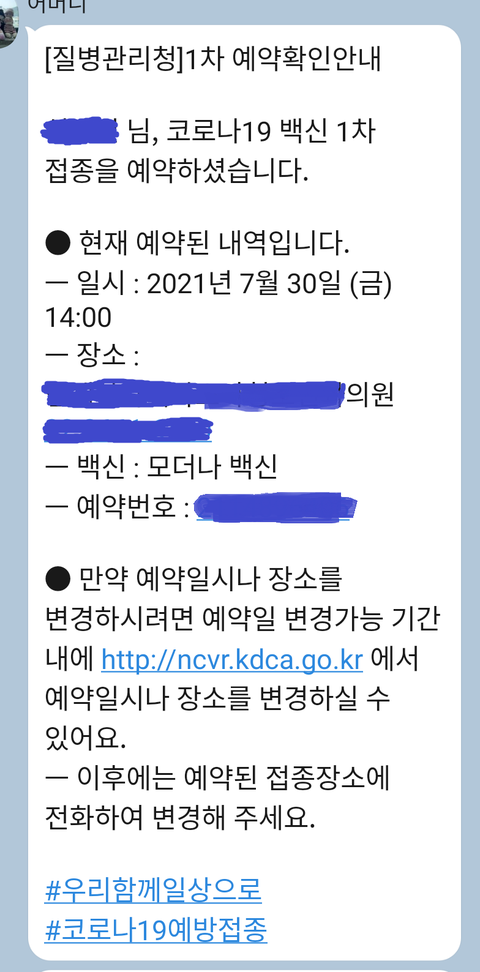 그리고 11일이 지난 어제 엄마한테 갑자기 접종 백신 종류가 바뀌었다는 문자가 아래와 같이 왔다네.