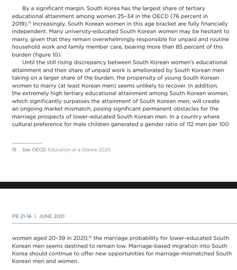 게다가, 한국 남성을 훨씬 능가하는 한국 여성의 극도로 높은 대학교육 성취는 지속적인 마켓 미스매치(결혼시장 부조화)를 창출할 것이다.