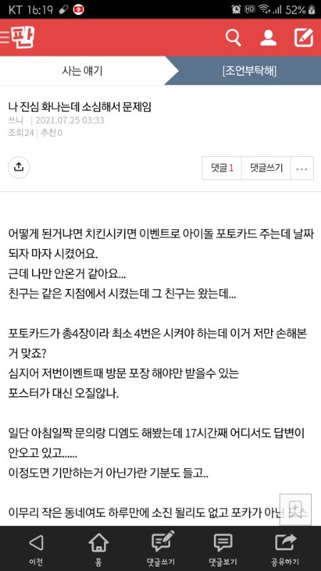진짜 화나는 포인트가 문의답변 없고 무시 당하는거 같고 소비자권리를 못받는거랑 포카를 다른 사람은 받았고 나는 못받은게 제일 화남