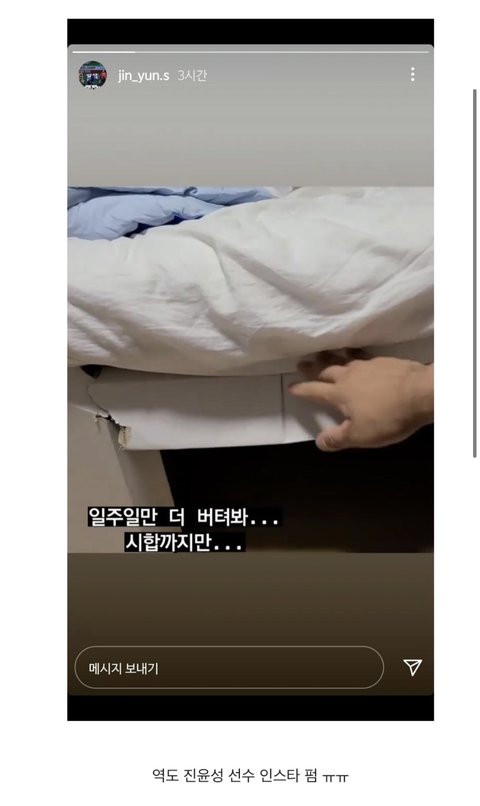 골판지 침대 벌써 박살난거 다들 알아줘 우리나라 선수들 다치지말고 커디션좋게 후회없이 경기하고 무사히 귀국하길 근데 침대는 진짜 멀쩡한거로 바꿔줘라