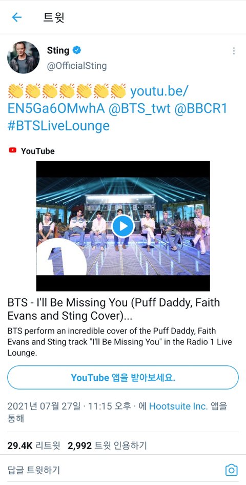 방탄 오늘 커버곡 원곡자가 박수쳐주네