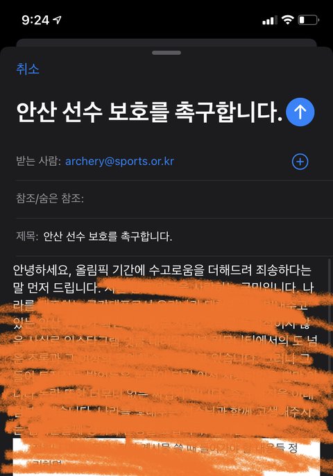 + 얘들아 내일 안산 선수님 양궁 개인전 경기 있거든 ㅠㅠ 남초에서 관련 글 이미 랭킹 가고 난리 났단 얘기를 들었어 우리도 가만 있지 말고 목소리 내줬으면 좋겠어 이거 내가 메일 보낸 거 인증이야! 말도 안 되는 일에 해명하거나 사과하는 일 없도록 도와주자 이걸 도와줘야한다는 것 자체가 어이가 없다