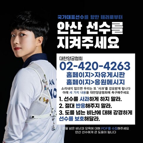 ⭕⭕안산 선수가 페미건 아니건 남자들이 뭐라할 수 없고, 페미는 잘못된게 아니다. 성희롱하고 선넘는 남자들 고소하고 안 선수 보호하라고 전화하자⭕⭕
