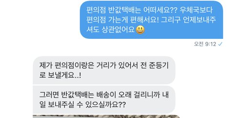 괜찮아? 자기는 월요일에 준등기로 보내줄테니까 난 내일 반택으로 달래 반택이 더 오래걸린다고.. 근데 둘다 보통 2일 걸리는데...