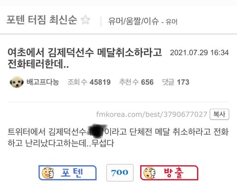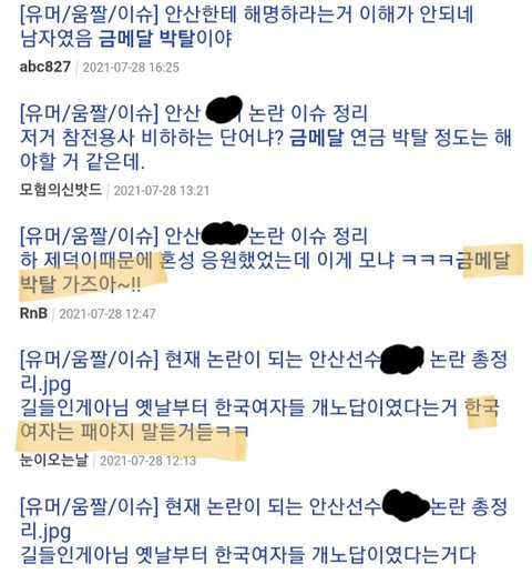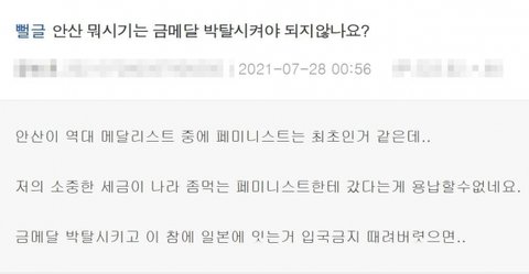 지금 남초에서 여자들이 금메달 박탈하자고 한거라고 조작중이거든 혹시 에타나 그런데서 그런글 보면
