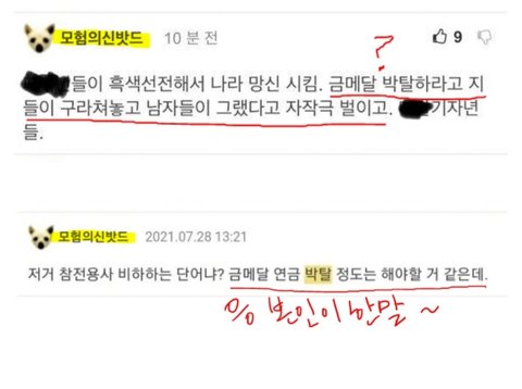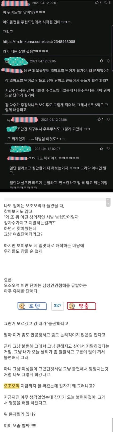 남초놈들 오조오억 웅앵웅 이런게 남혐단어 아닌거 알면서 걍 여초단어=남혐으로 만드는거임ㅋㅋㅋ 우리도 남초단어 여혐으로 몰아야됨 쌉어쩌구,이건못참지,버억,야발 이런거. 근데 애초에 남혐단어는 99%가 여혐ㅋㅋ