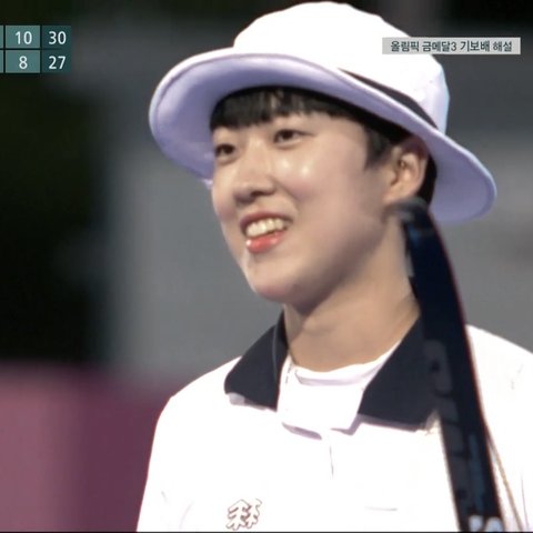 오늘 개인전 16강 텐텐텐으로 진출❤ 짤은 텐텐텐쏘고나서 살짝 웃는 안산선수❤