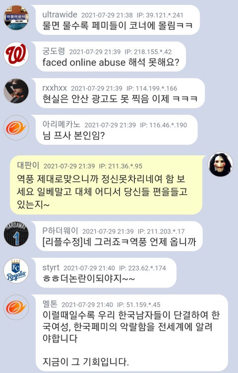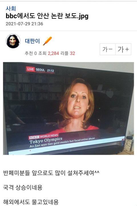 안산 선수 페미라고 금메달 박탈하라고 외신에 제보하고 막 난리친 결과 이제 이 사건이 bbc에도 보도 됐는데... 쪽팔려하기는 커녕 이제 외국 사람들한테 페미들 욕 먹을거라고 좋아하고 있음 아니 한번 전세계적으로 꼽 먹었으면 좋겠다고 생각은 했는데 이제 실제로 그런 일이 실현될 것 같으니까 너무 창피해 ㅅㅂ ㅠㅠㅋㅋㅋㅋㅋㅋㅋㅋ
