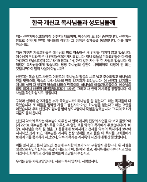 신약의 약속의 목자께서 "한국 개신교 목사님들과 성도님들께"