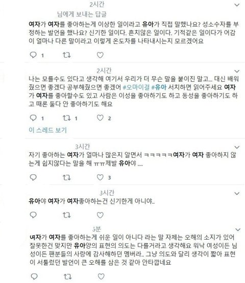 유아가 이렇게 확실히 얘기한지 모르겠는데 맞다해도 왜 여성혐오야?성소수자 비하발언이라던데 왜?그리고 성소수자 비하 하는거였으면 브이앱에서 유아가 언니 여자친구 할래?이랬을까?물론 저건 2018년도 브이앱은 2020년도인데 저게 왜 성소수자 비하인지 모르겠어서 저때 욕 많이 먹었어?트위터에서만 욕먹었나..