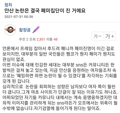 그 윗댓글은 "안산이 혹시 페미 까는 발언해도 여초가 안산 편들어줄까"라는 아무 가치 없는 댓글ㅋㅋ