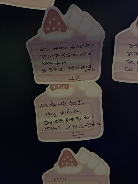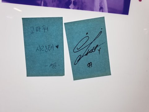 성윤이는 생카 들려서 팬들 커피 사주고 앞으로 올 사람들 음료 제일 비싼걸로 미리 계산하고 갔대 그리고 생일 광고에 포스트잇 붙이고 갔어 주찬이는 씨지브이 홍주찬관 들려서 쪽지 남기고 갔대 ㅠㅜㅠㅠㅠ완전 감동ㅠㅠㅠㅠ