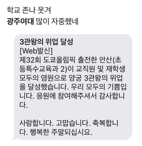 ㅋㅋㅋㅋㅋ 많이 자중했네ㅋㅋㅋㅋ 진짜 나였으면 안산!!!!! 우리학교의 자랑 안산선수가!!!!! 도쿄 올림픽에서 3관왕을 차지했습니다!!!!!!! 너무 자랑스러운 우리학교의 자랑입니다!!!!ㅠㅠㅠㅠㅠ 박수쳐주세요ㅠㅠㅠㅠ 할듯ㅋㅋㅋㅋㅋ