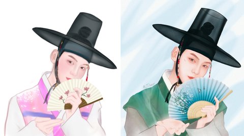 왼쪽 그림은 그 핑크 한복 입은 당일 날 대충 그려놓은거고 오른쪽이 다음 날 열심히 그린 최종본!! 정말 하루종일 그림만 붙잡고 있던 기억이.... 근데 정말 얼굴 밖에 그릴 줄 몰라서 얼굴 말고는 다 엉망이야...ㅋㅋㅋㅋ 부채는 사진 복붙!!^^