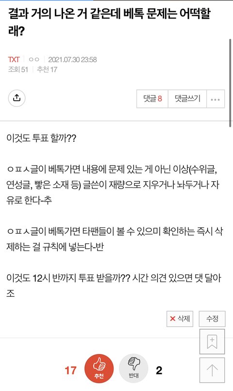 이건 아직 진행중이야 댓에 의견 있으면 내주고 투표 해줘!!!