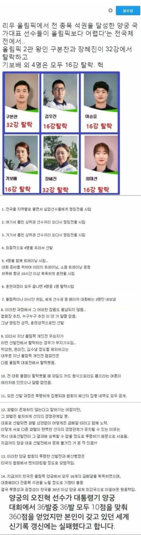스폰서 기업이 현대 하나라서 자기회사가 밀어주는 선수가 없는것도 이유라고 봤는데 잘하는 새싹들 훈련시키는 비용부터 다 스폰을 양궁협회가 해줘서 사교육없는 종목이라 파벌형성 안됨