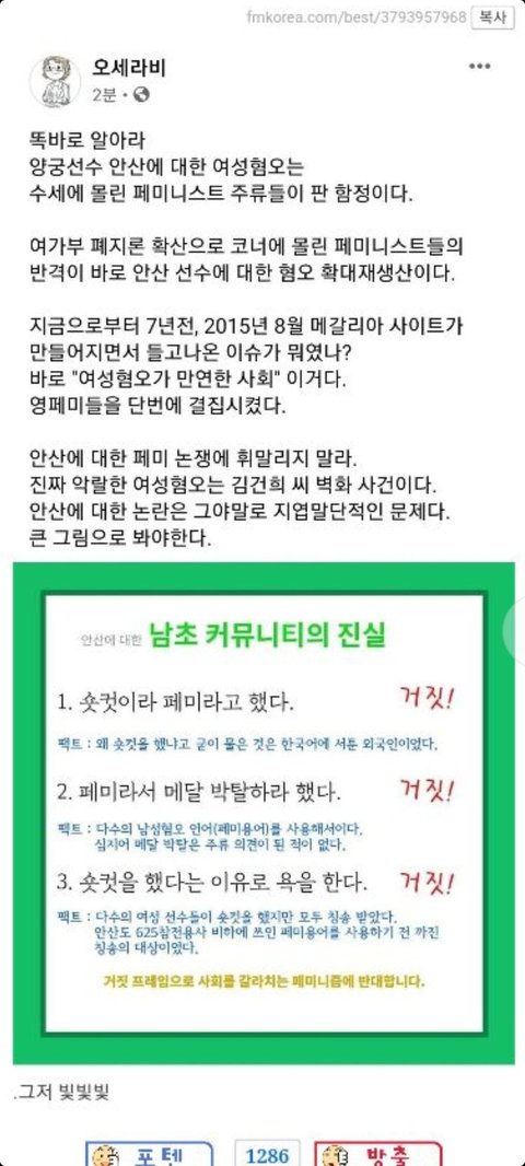 오세라비님 배리나하고 토론한거 보고 되게 좋게 봤는데 이건 진짜 실망이네 민증까서 남자인증할 수 있는 남자인데 탈코르셋이랑 페미니스트의 모순점같은 건 잘 지적하더니 이번 문제는 납득할 수 없음. 남초 커뮤니티에서 안산 선수를 비하하는 거 정말 어렵지 않게 볼 수 있는데 근거 넘치는 와중에 오세라비님은 근거도 없이 아니라고만 말씀하시네 그런 분 아닌 거 같았는데 진짜 실망이다. 이퀄리스트 관점에서 보셨을 때 마찬가지로 남초 커뮤니티만 싸고 돌면 여성인 안산 선수는 뭐가 되나요?