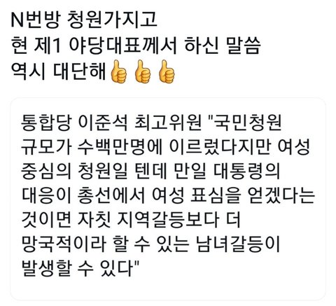 우리가 계속 정치얘기를 하고 관심을 기울이는 이상, 저런 발언을 함부로 할 수는 없겠지. 그리고 비로소 여성을 제대로 존중할 줄 알게 되었을 때, 저 정당에 조금이라도 호감이 생길 거 같다.
