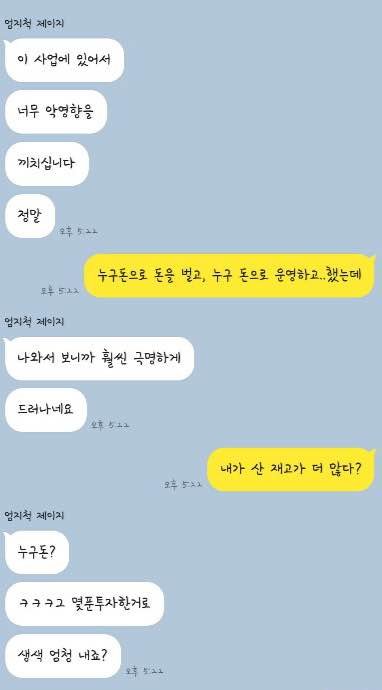 ‘몇 푼 투자해놓고’, ‘너희 친정 돈으로 사업한 적 없다, 누가 보면 내가 빌어서 돈 받아와서 사업한 줄 알겠다’ 라며 배은망덕한 말을 하고 있습니다.