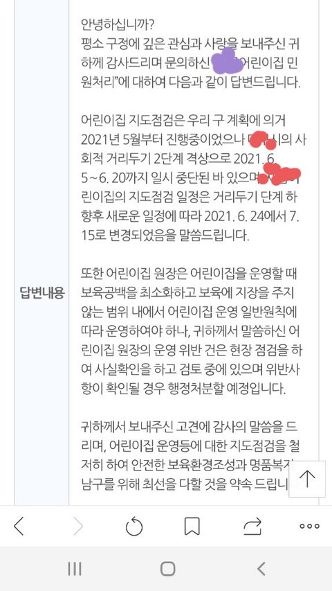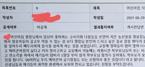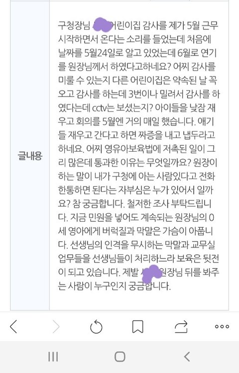 6.제일 큰 문제점 구청에 민원제기함. 직원이 방문하여 아는사람인지 서로 친근하게 인사하며 1시간동안 수다떨고 감. (심지어 부원장이 교사들에게 구청직원에 대해 "쟤 ○○이 잘아는애라 걱정안해도되"라 이야기했다함)