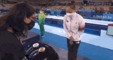 메달 받고 어찌 할 줄 몰라서 눈치 보다가
