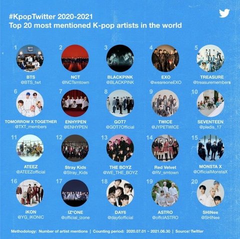 2020년 2021년동안 케이팝가수 전세계 트윗량언급 순위