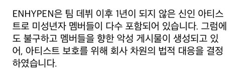 ENHYPEN은 팀 데뷔 이후 1년이 되지 않은 신인 아티스트로 미성년자 멤버들이 다수 포함되어 있습니다. 그럼에도 불구하고 멤버들을 향한 악성 게시물이 생성되고 있어, 아티스트 보호를 위해 회사 차원의 법적 대응을 결정하였습니다.