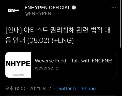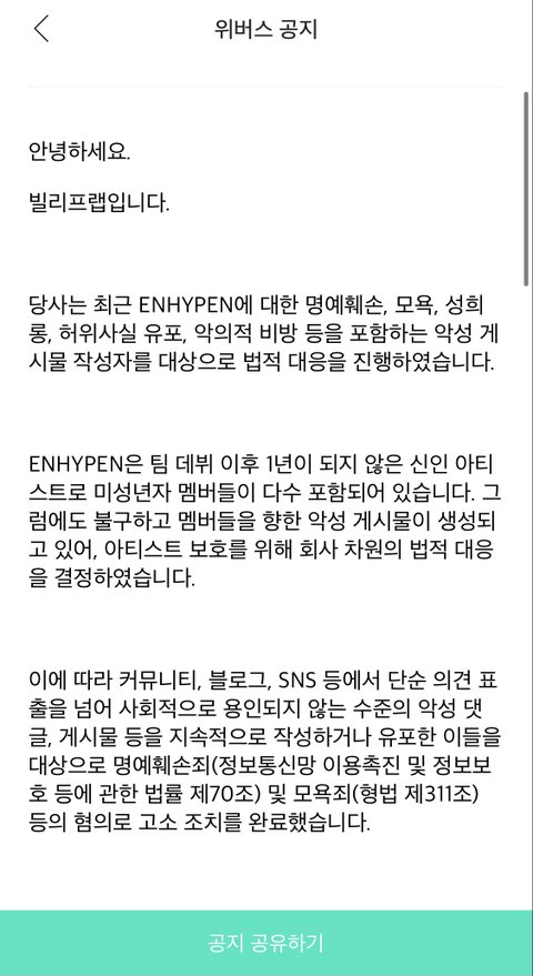 당사는 최근 ENHYPEN에 대한 명예훼손, 모욕, 성희롱, 허위사실 유포, 악의적 비방 등을 포함하는 악성 게시물 작성자를 대상으로 법적 대응을 진행하였습니다.