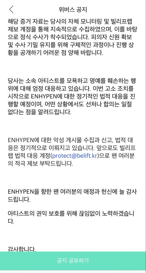 ENHYPEN에 대한 악성 게시물 수집과 신고, 법적 대응은 정기적으로 이뤄지고 있습니다. 앞으로도 빌리프랩 법적 대응 계정(protect@belift.kr)으로 팬 여러분의 적극 제보 부탁드립니다.