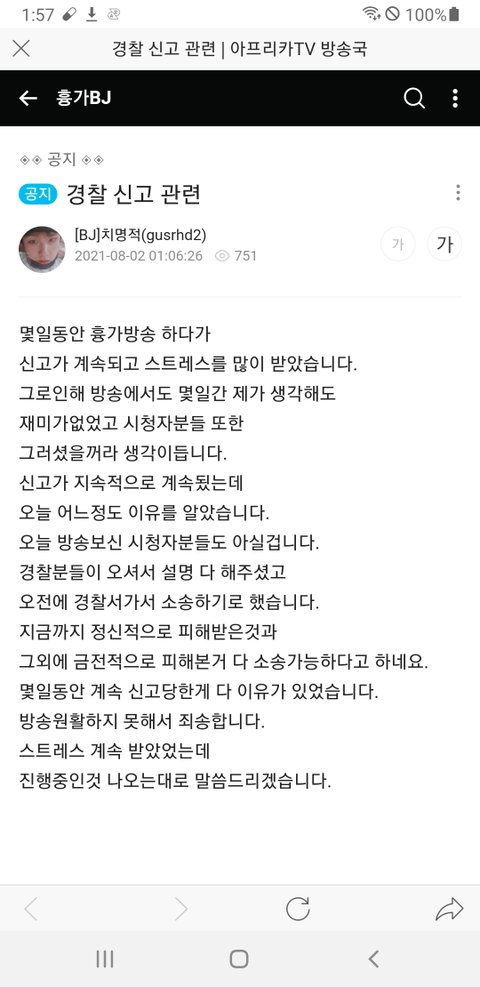 "신고자가 자꾸 신고해서 스트레스 받고, 경찰하고 조우할까봐 불안 초조하여 밥도 못 먹겠고, 방송도 제대로 할 수 없어서 괴롭힘을 당하는 것 같아 신고자를 처단해주세요."