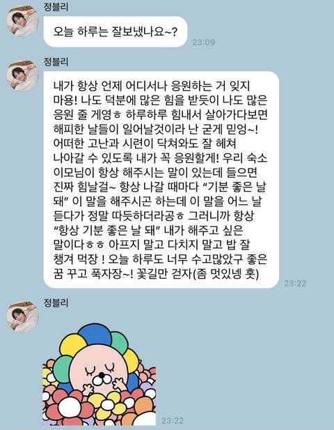 2시간동안 버블해주다가 끝엔 저렇게 장문보내고 잘자라해준 뒤에 계속 틈틈이 새벽 4시 넘어서까지 버블 읽다가 가주는데 어떻게 안 사랑함ㅠㅠㅠ