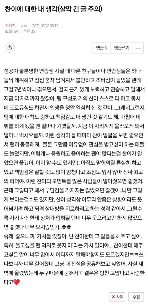그냥 내가 해줄 수 있는건 사랑을 더 듬뿍 주는거겠지? 방찬 사랑해 방찬 힘들지마 고마워 사랑해