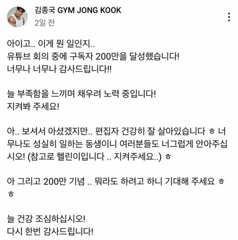근데 200만 기념이니까 다른 게스트처럼 같이 운동하는 건 아닌 것 같고, 검고처럼 뮤비같은 거나 음.. 아니면 혹시 에이티즈 춤 변형해서 헬스동작이랑 접목시켜서 막 유튭에 돌아다니는 살빠지는 춤 처럼 이벤트로 (예를들어) 헬린이들을 위한 춤? 같은 거 같이찍는 거 는 아닌 것 같지? 웅 내가생각해도 그런 것 같아ㅋㅋㅋ 아 살짝 에이티즈덕질하다보니까 의심병걸린 것 같음 트윈타워만 연습실 남아있는 것도 저 200만 글 보고나서는 김종국님이랑 연습하는 것 같고 살려줘