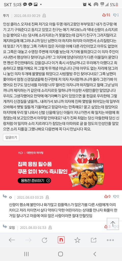 ㅋㅋㅋ글 박제될줄 알았음. 추가글이 압권이죠. 여자애는 일부러 물을 튀었다니.... 물가에 가까이 의자를 두면 당연히 튀지...의자에 물튀었다고 소리 지르는 ㄴ이나 이걸 지들 잘했다고 글까지 쓰는 ㄴ이나... 잘 만났음. 애새끼들 절대 결혼시키지말고 넷이 꼭 죽는날까지 함께했으면 좋겠네...저런 부모에게 뭔 가정교육이라는 걸 받겠음?
