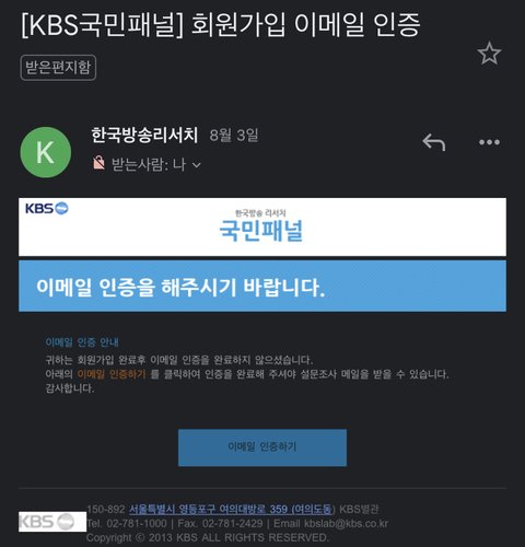 kbs패널 그냥 회원가입만 하면 끝이 아니더라ㅠㅠ 이메일함 들어가서 인증하기도 해야 해!!! 나 몰랐다가 방금 이메일함 들어가서 알았다ㅠㅠ