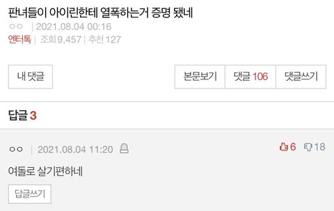 헐 오늘 아이린 글에서도 이런댓글 있던데 ㅋㅋㅋㅋㅋㅋㅋㅋ 그리고 얼마전 최유정 까글 베댓도 남돌이었으면 난리났는데 여돌이라 어쩌고~ 하면서 비아냥대는 댓글이 베댓 아니었음? ㅋㅋㅋㅋ 그리고 제니 그 콘서트 까글에서도 남돌이었으면 난리났다는 댓글이 베플이었던적 있었고 요즘 장원영 글 계속 올리는 걔도 남돌이 더 까이는데 장원영 시녀들 유난떤다는 내용의 글 계속 올리던데 ㅋㅋㅋㅋ 개소름이다 여돌한테 열폭 ㅈㄴ 심한년인가봐