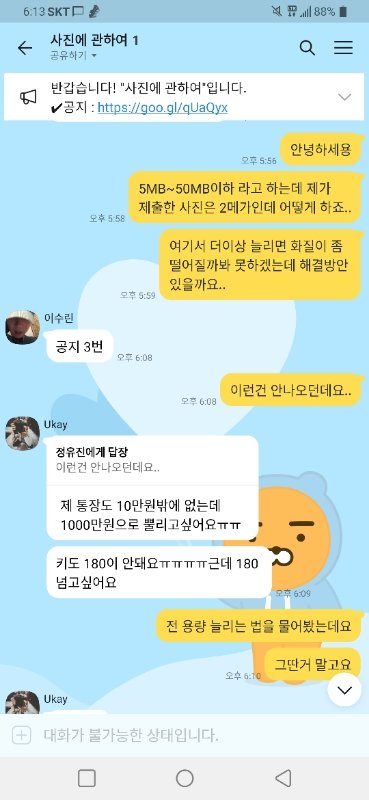 공모전 준비하는데 사진은 5NB~50MB이하 라고 정해져있었어 근데 내가 찍은 사진은 2MB야 이것도 사진 크기 늘린거란 말이지? 그래서 내가 인터넷에서도 찾아보고 했는데 안나오길래 사진관련 옾챗에 들어가서 물어봤어 근데 욕 막었거든 내가 잘못한거야?